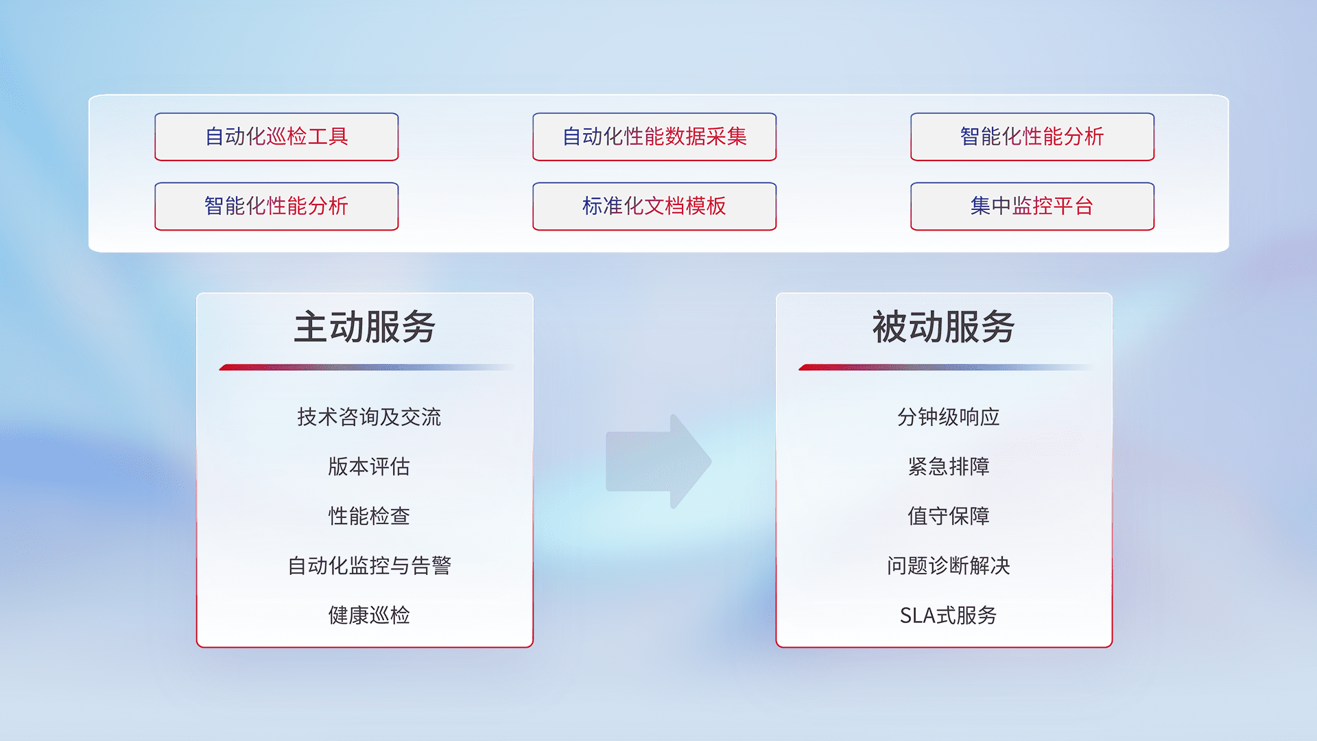 智能化工具和标准化文档,,,,保障服务质量,,,提供主动服务(包含技术咨询、、、、版本评估、、、、性能检查、、、、自动化监控与告警、、健康巡检)和被动服务包含(分钟级响应、、紧急排障、、、、值守保障、、问题诊断解决、、、SLA服务)。。。